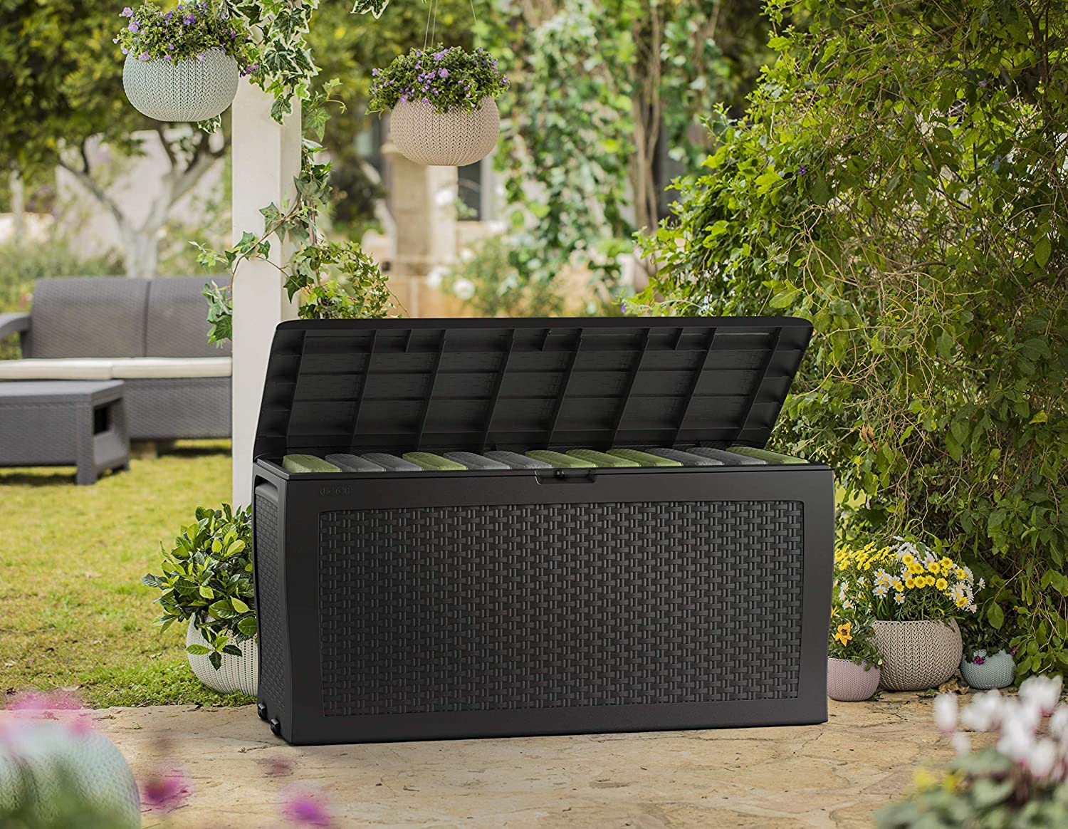 Dry, ventilated storage space in an attractive rattan look. The Samoa storage box from Keter offers considerable storage space with 270 litres, but at the same time is so compact that it can be stored anywhere to save space. Whether seat cushions, garden tools or children's toys, with the Samoa box from Keter the contents always remain dry and well ventilated.