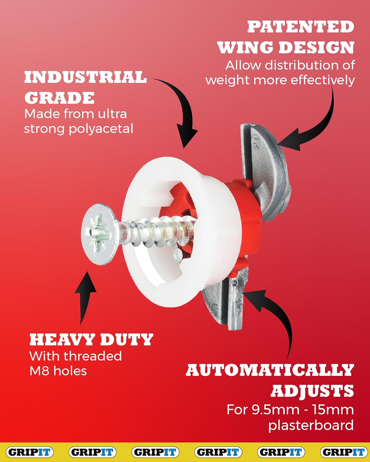 EFFORTLESS INSTALLATION: Designed for quick, hassle-free setup. Suitable for 9.5mm-15mm plasterboard thickness. Please use a 18mm drill bit to install Gripit Red. Just mark, drill, tap, and twist for a secure fit. Ideal for DIY enthusiasts and professionals alike.