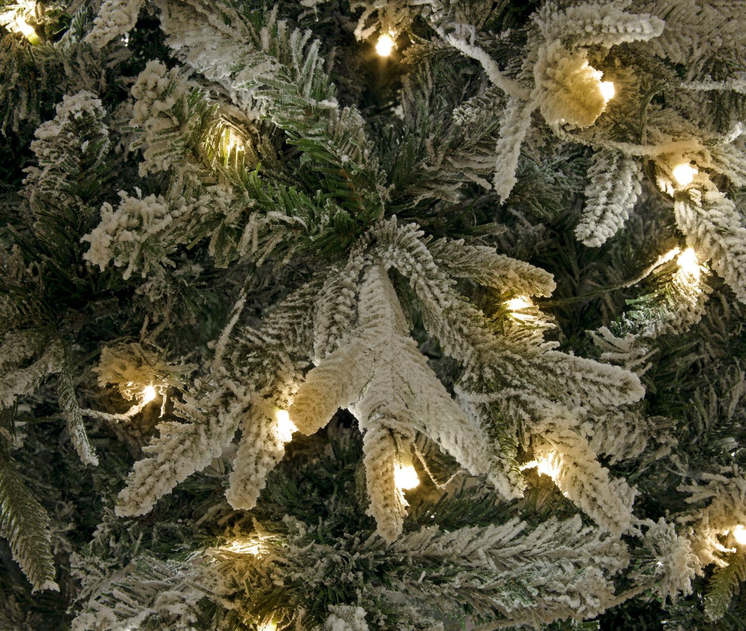 Elegant Artificial Christmas tree covered in white snow dust with various types of tips.