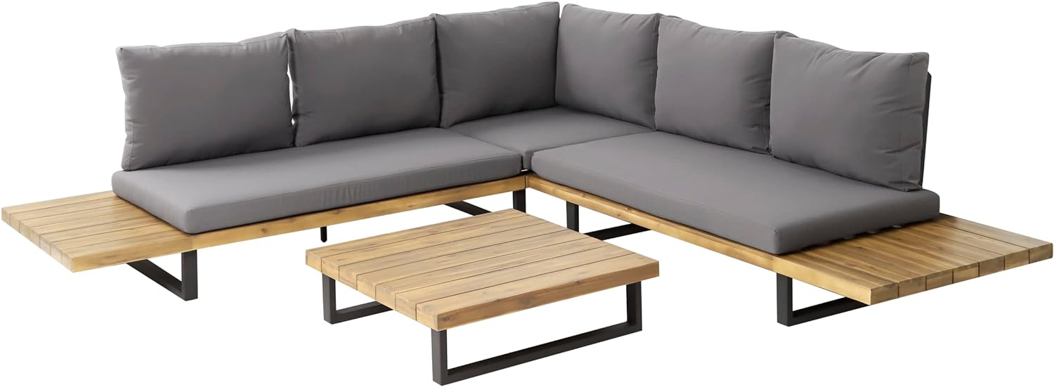 Our stunning William L Shape Corner set brings a modern yet stylish feel to any outdoor space. Very low maintenance solid Acacia & powder coated steel frames, combined with shower proof thick cushions create a ultra modern yet comfortable set. Acacia hardwood is amazingly hardwearing and is supplied to you with a protective oiled finish! The metal part of the frame is powder coated with a dark anthracite grey appearance. Fire retardant cushions and beautiful Acacia hardwood, this set is a stylish and practical choice that will stand the test of time.
