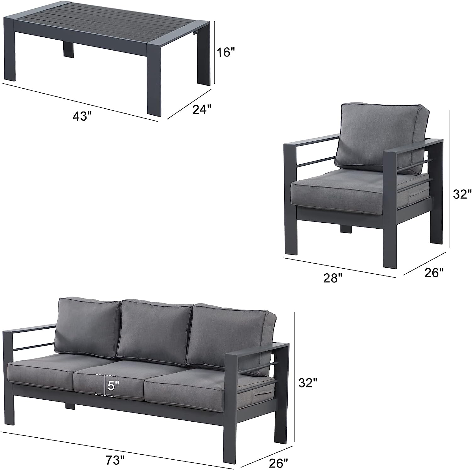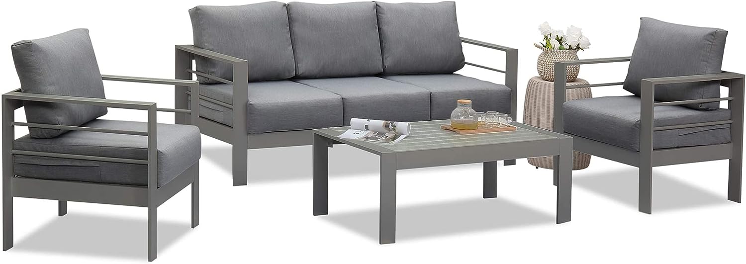This 4-piece aluminium outdoor furniture use strong aluminium frame and thick cushion is ideal for both entertaining and relaxing. Careful handmade crafts is what we insists, all we want to do it provide you the most comfortable experience. Now, please enjoy a calm and soothing night or a cool sunny day on your new sofa set.