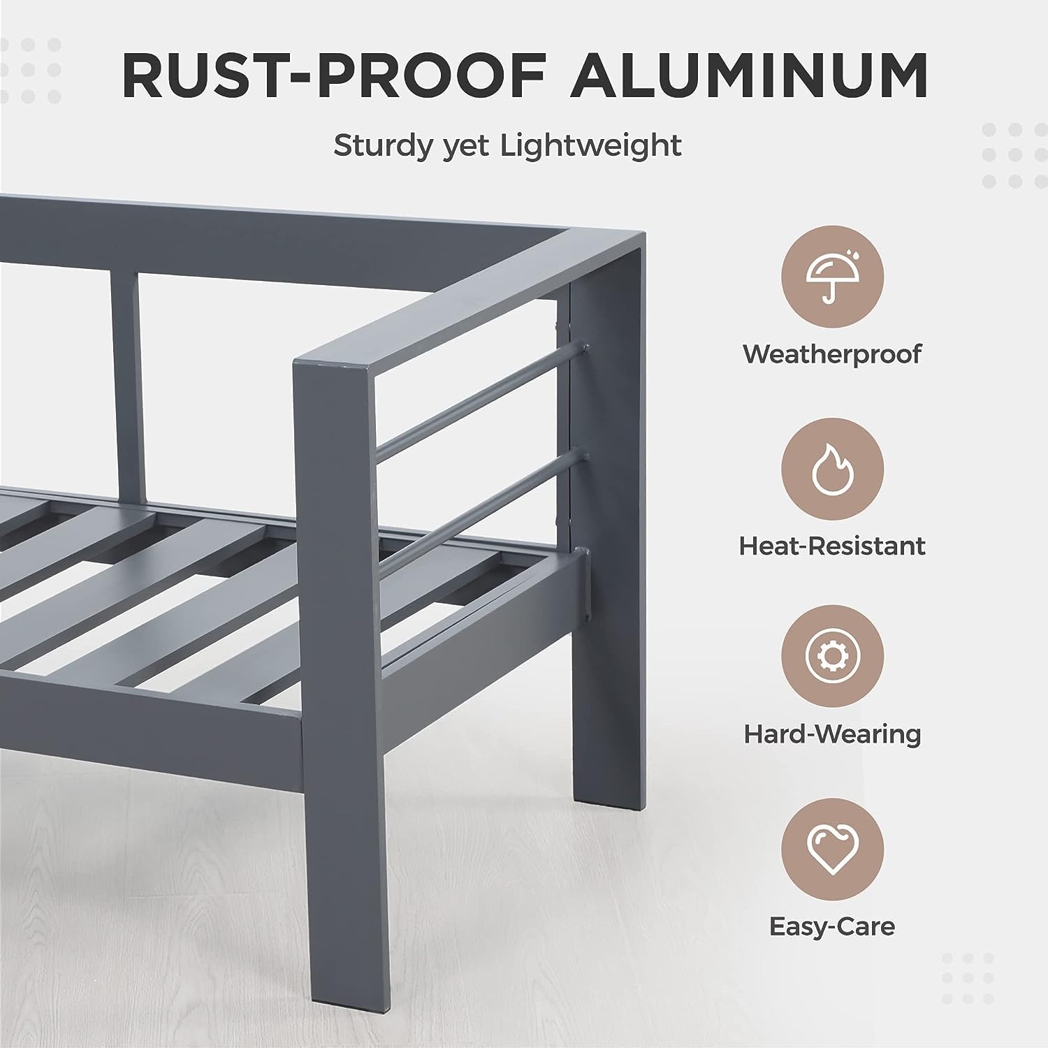 ALUMINUM PATIO FURNITURE SET In addition to its modern visual appeal, it’s standing out in fine techniques such as a thick gauge aluminium frame and richly powder-coated finish, which distinguishes our outdoor patio furniture from other metal furniture. The lighter-weight patio furniture is crafted to stand the test of time without fading, moulding or rusting.