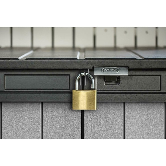 Make your outdoor living space more elegant and store various items securely with the Elite-Store shed. Designed with durability in mind, this storage unit features an ultra-rugged, all-weather build, with rib-reinforced DUOTECH™ walls. The paintable surface also boasts an attractive wood effect texture that won’t rust, peel, or rot. Made with a capacity of 1150 L / 41 cu.ft, this unit will easily hold two 240 L/63 Gal wheelie bins, or outdoor furniture, garden tools, or a BBQ and accessories. A hydraulic piston mechanism, lockable lid, and adjustable brackets complete the design.