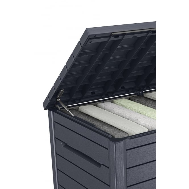 The cushion box Ontario has everything you need. The plastic box is quick and easy to assemble, is weather proof and its modern design in wooden look is visually appealing. Thanks to the huge capacity of 870L. inside is the best place to go with plenty of storage space for cushions, Garden toys or to keep contents dry.