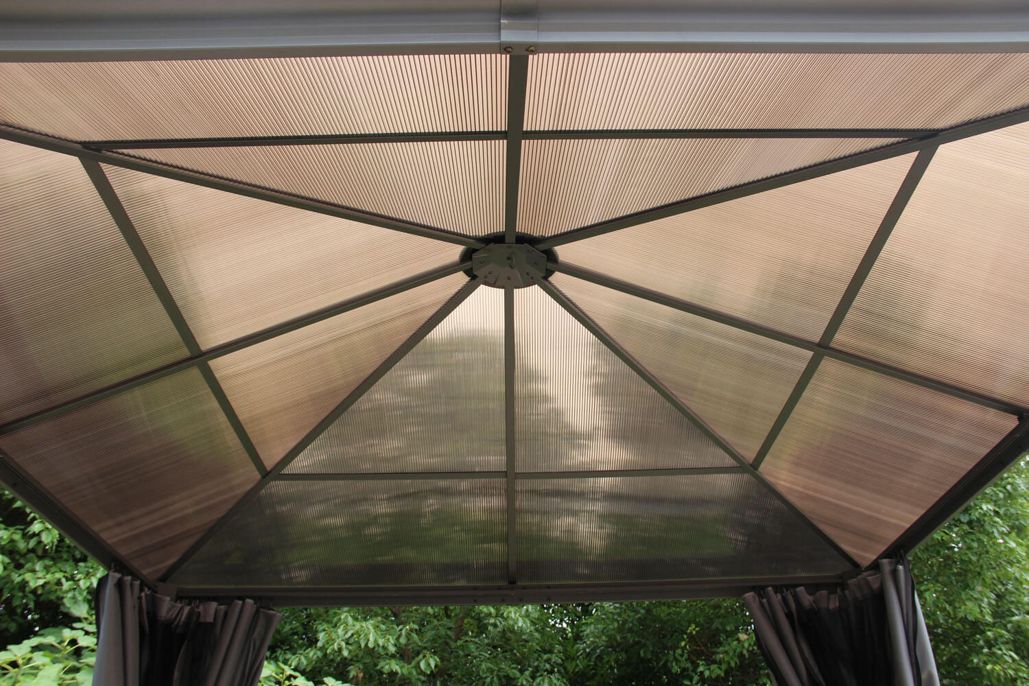 This water resistant gazebo has a waterproof lightweight polycarbonate roof allowing just the right amount of sunlight through.