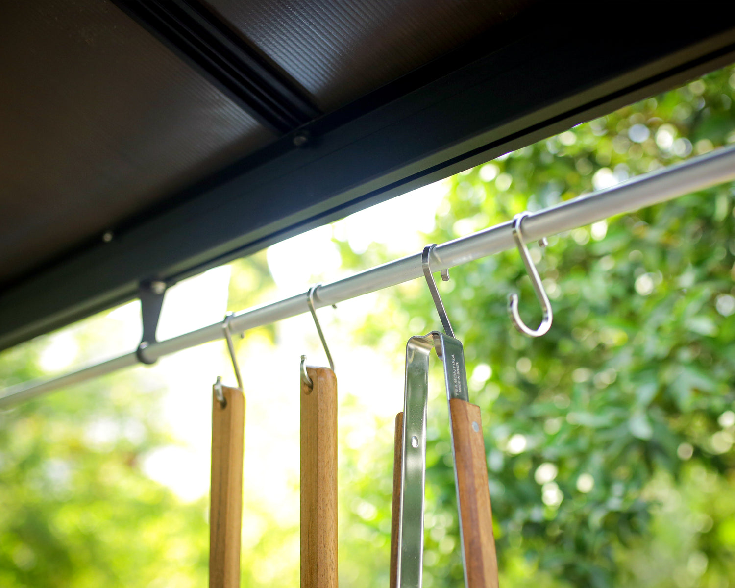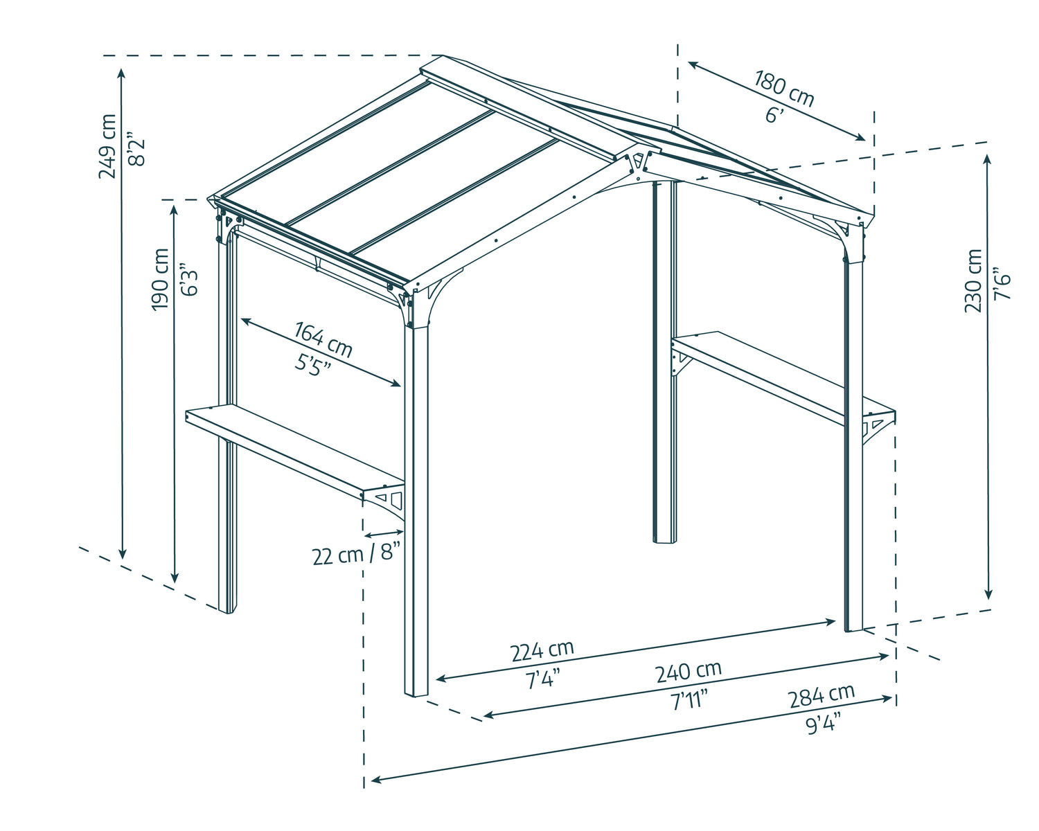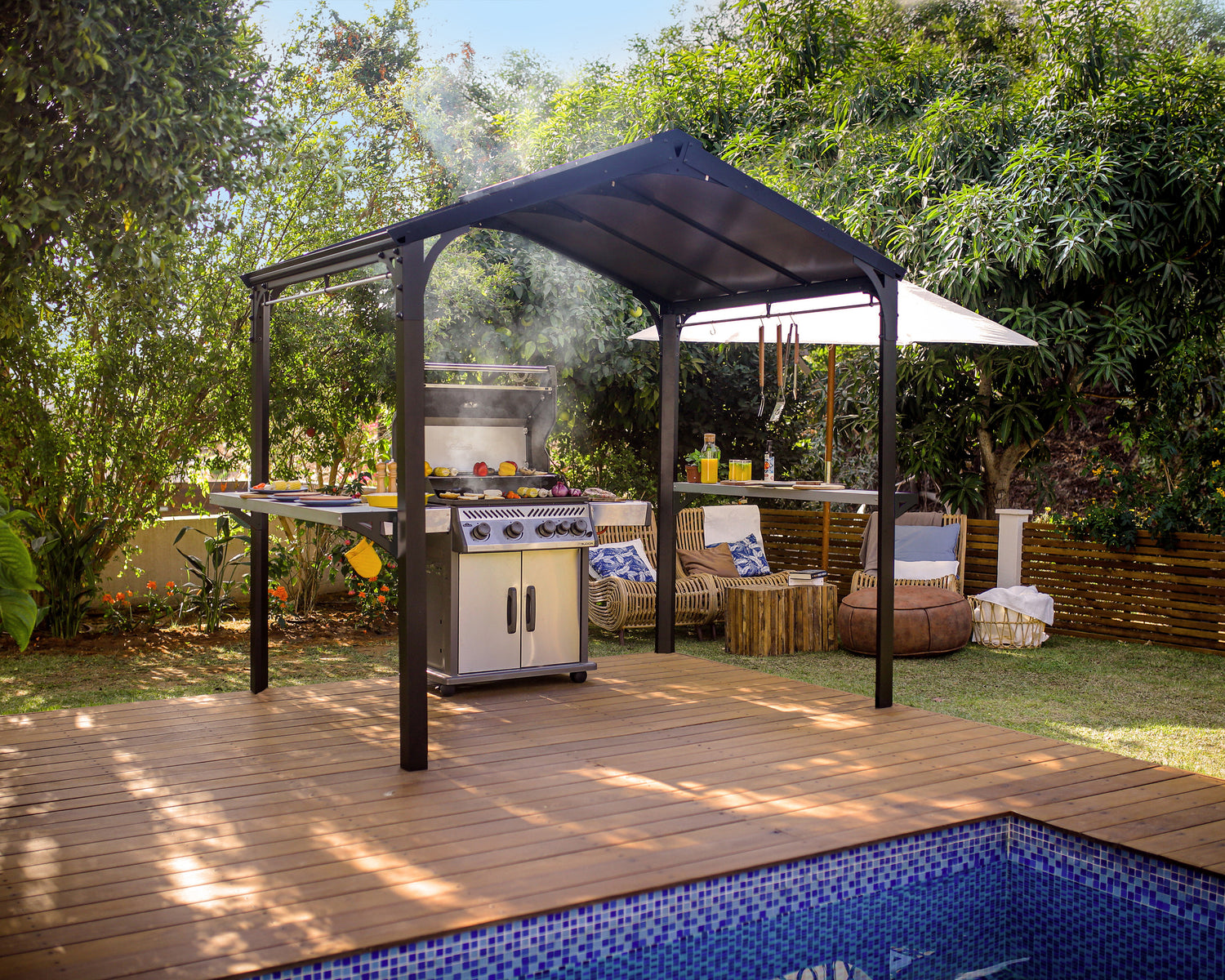 There is something about that barbecue smell that says summer like nothing else and the Austin BBQ Gazebo makes sure nothing comes between you and that grill. The ultra-durable 6 Ft x 8 Ft aluminum frame protects the cook and food from getting soaked in the rain or burned in the sun and the peaked roof features a vent that allows smoke to get out without letting anything get in. In a sophisticated black, with 7’4” between heavy-duty posts, and 7’2” of head space, you can also use the grill gazebo to setup a small outdoor sitting or dining area, or as a bike shelter. It has two built-in steel countertops you can use for prepping while cooking and hooks to hold your utensils, or you can use the shelves to serve drinks to your friends and family and add planters to the hooks for a luxe garden experience. The Austin grill shelter is ultra-durable, it looks great, and it keeps you safe and dry, making it the perfect upgrade to your yard.