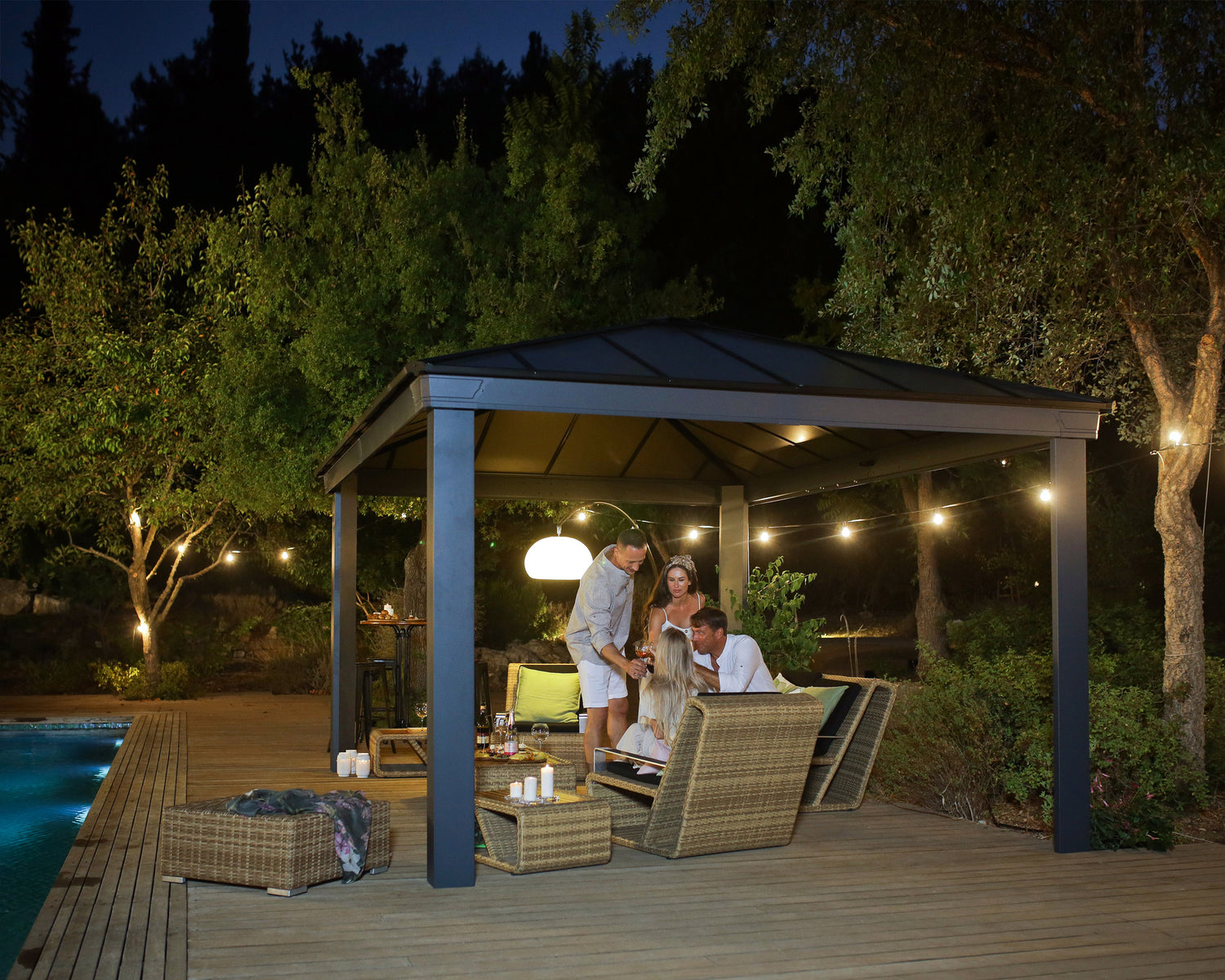 - Accessories: Structure can be fitted with both curtains and netting (sold separately). Perimeter / internal lighting can be added (sold separately).