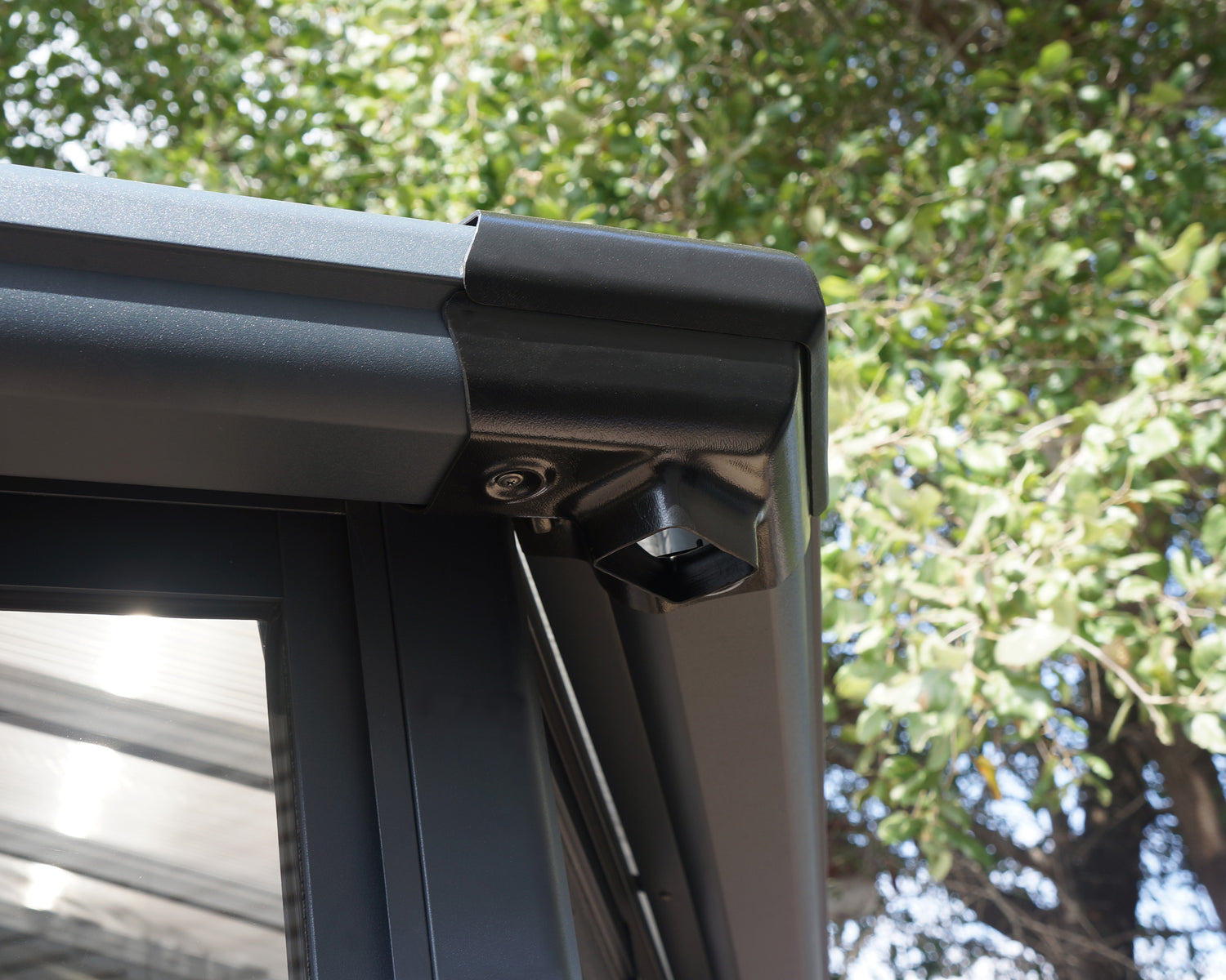 - Granulated anthracite powder-coated frame is made of heavy-duty aluminum profiles and laser cut galvanized steel connectors