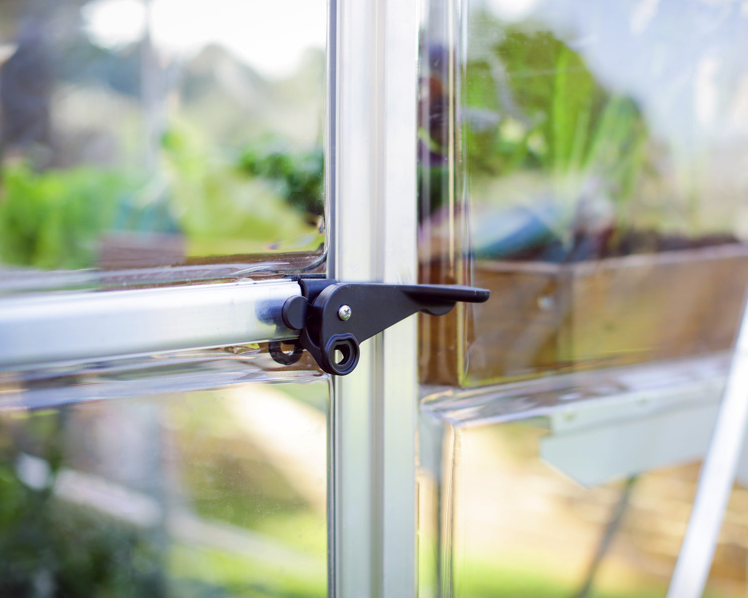 The hobby greenhouse frame is made of rust-resistant aluminum mounted on a heavy-duty galvanized steel base for ultra-durable structural support. Other features include an integrated rain gutter to disperse the rainwater, a roof vent, and a lockable hinged door with a magnetic catch to help control temperature and humidity. The unique sliding panel system creates better insulation, stronger resistance to wind, and makes it easier to assemble than other DIY Greenhouses.