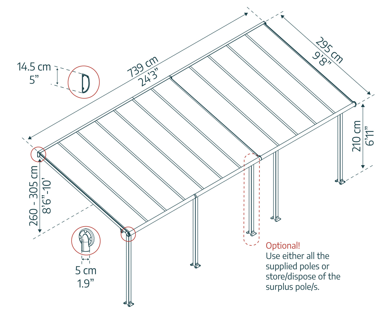 Whether you want an outdoor space to entertain, celebrate special family events or simply relax in your outdoor spa, the Olympia Patio Cover has got you covered. It provides you with an ideal setting to enjoy your garden and de-stress at the end of the day. The Olympia is robust, sturdy, and durable, comprised of heavy-duty, powder coated corrosion resistant aluminum structure and virtually unbreakable, 100% UV protected, light diffusing multi-wall polycarbonate roof panels. Be creative with your new luxurious, Olympian style outdoor lounging space; add some glamour to your garden appeal and turn your outdoor area into an elegant addition to your home and lifestyle to be enjoyed throughout the year.
