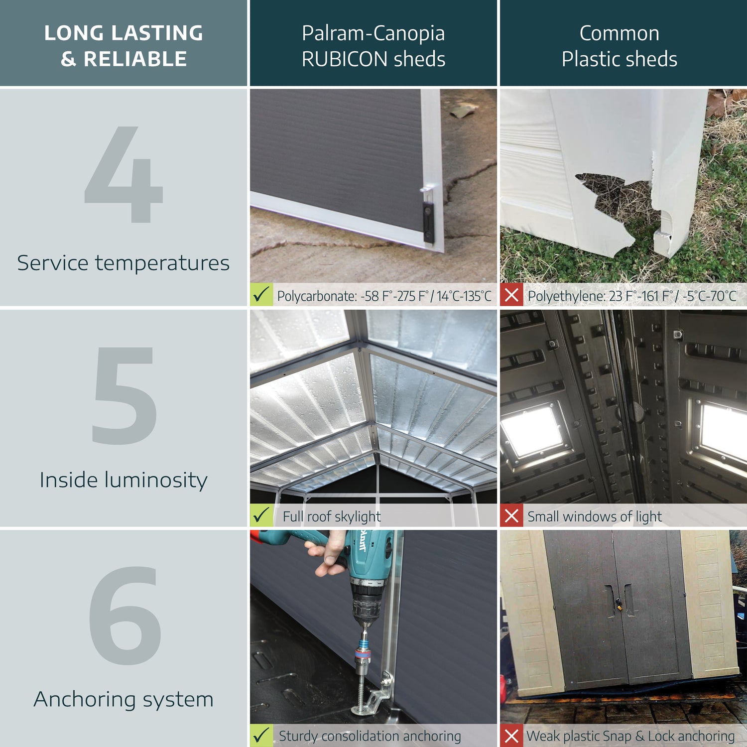 - Palram – Canopia sheds Resist humidity, fungal decay, and termites.