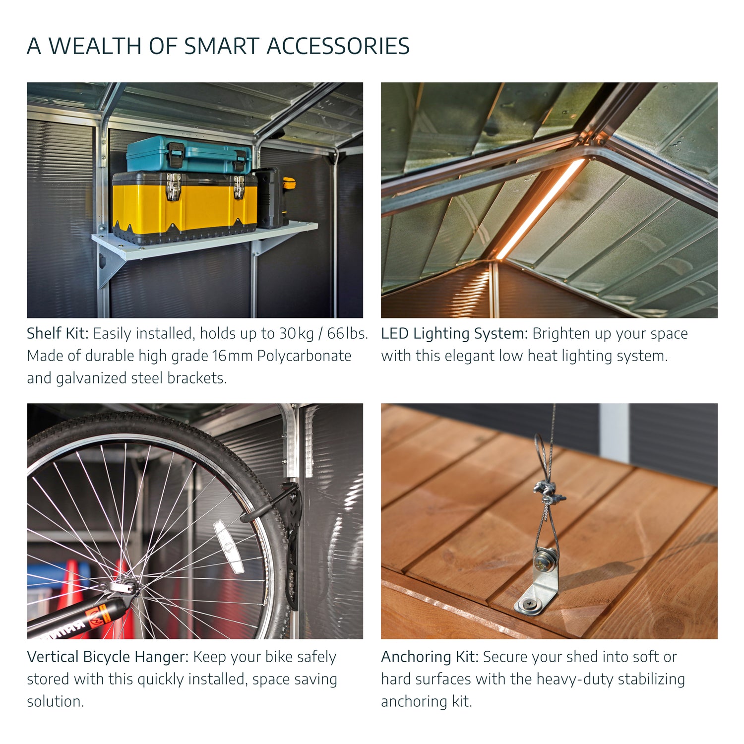 - Robust, highly resistant, sunlit storage shed, designed to withstand extreme weather conditions.