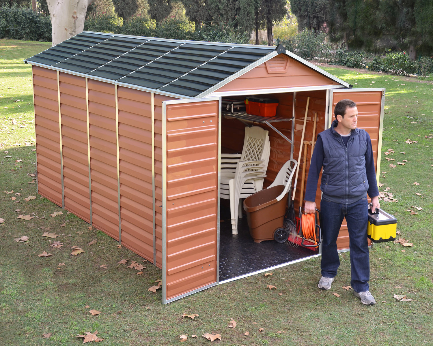 The Skylight garden storage shed is made with a reinforced aluminum frame and flexible polycarbonate panels specially engineered to withstand the expansion and shrinkage associated with weather changes. The panels do not bend, fracture, or discolor over time, giving your things maintenance-free protection for years to come. The unique Skylight roof panels transmit natural sunlight during the day while giving you opaque external visibility for maximum privacy. Designed with your outdoor living needs in mind, the Skylight plastic shed will complement your home, enhance your outdoor living space, and organize and protect your things.
