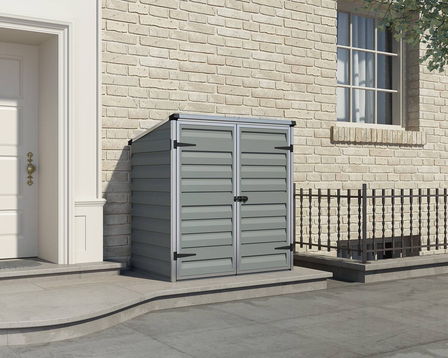 The right amount of storage to fit your needs, the Voyager Shed is perfect for storing your recycling bins, gardening tools, and organizing your outdoor life. The Pent small storage shed is made with a reinforced aluminum frame and flexible polycarbonate panels specially engineered to withstand the expansion and shrinkage associated with weather changes. The panels do not bend, fracture, or discolor over time, giving your things maintenance-free protection for years to come. The unique Skylight roof panels transmit natural sunlight during the day while giving you opaque external visibility for maximum privacy as well as front and back vents for ample airflow. Designed with your outdoor living needs in mind, the small plastic shed can be installed as a lean-to shed or a standalone unit.