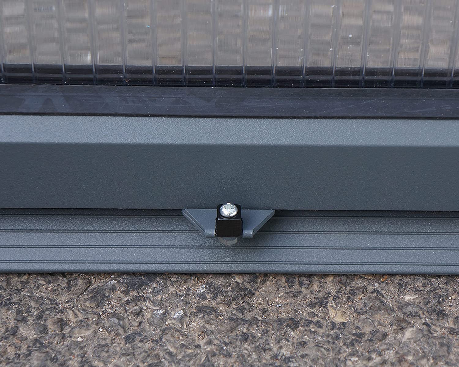 The Glory greenhouse has a gray powder-coated aluminum frame and includes a galvanized steel base kit that adds even more height, structural support, and stability. Combined with the 10 mm high impact twin-wall polycarbonate panels, you have a greenhouse that is as resilient and functional as it is aesthetically pleasing.