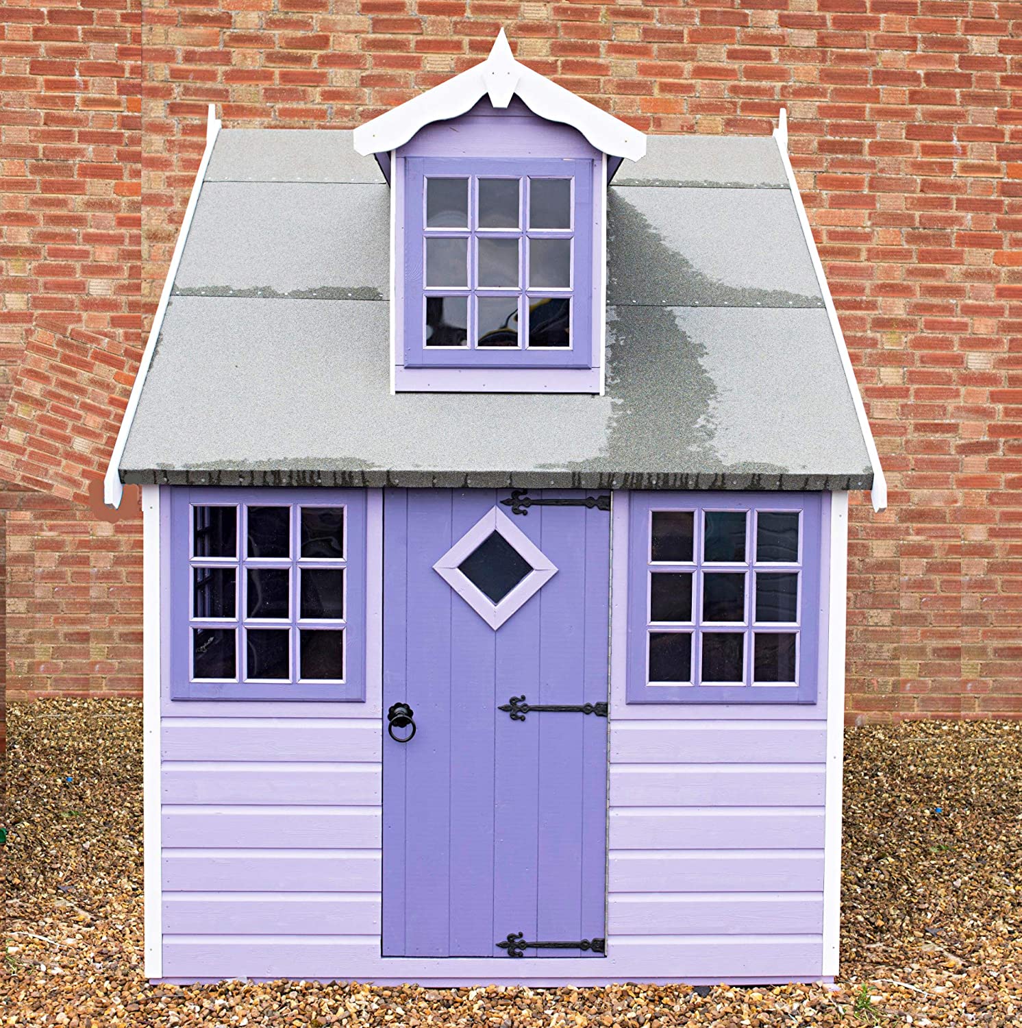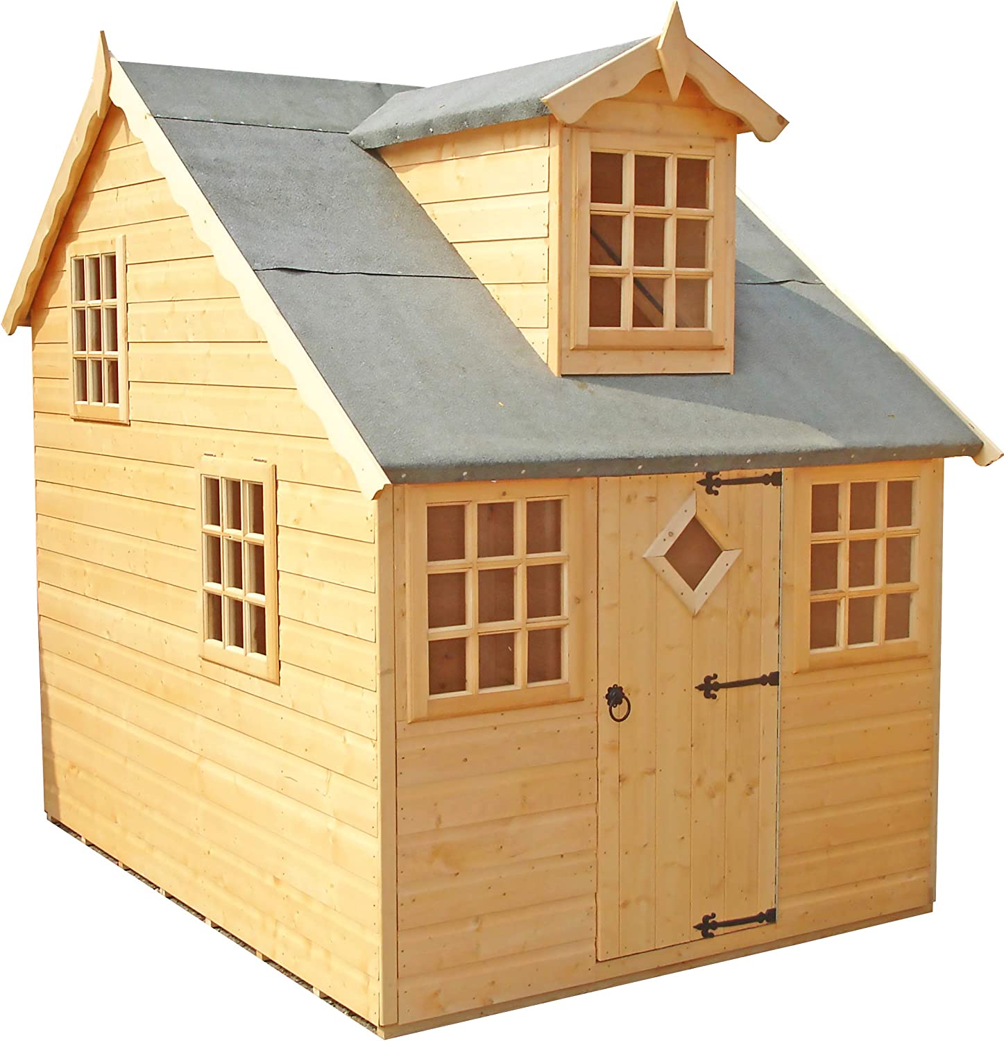 An amazing dream cottage in your own garden oozing fairy tale charm. Our Enchanted Cottage will make a show stopping feature in your garden as well as keeping all princes and princesses happy! Five windows including one opening side window and a delightful dormer window allow lots of light. A shaped facia and two window boxes add the finishing touches as well as the pretty mock antique hinges and diamond window detail to the door. The 'Upstairs' comes complete with balustrade, ladder and banister rail. Made in the UK with high grade FSC approved shiplap timber over sturdy 34 mm framing with T&G roof and floor. This playhouse complies with BS EN 71 the safety standard and carries the CE mark. The door is fitted with a full length piano hinge to prevent finger traps and the 5 windows are glazed with acrylic.