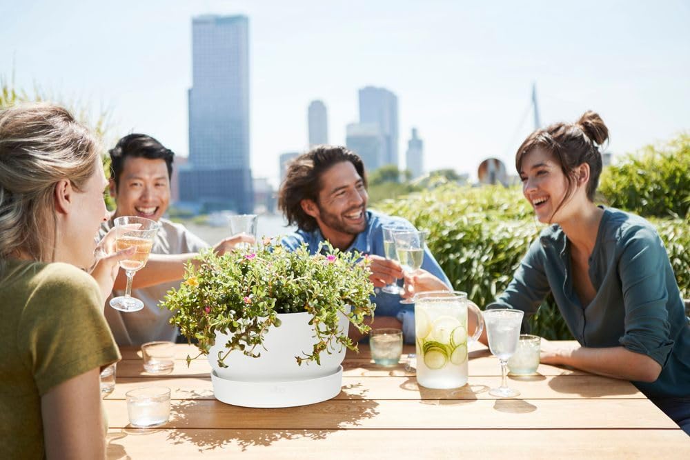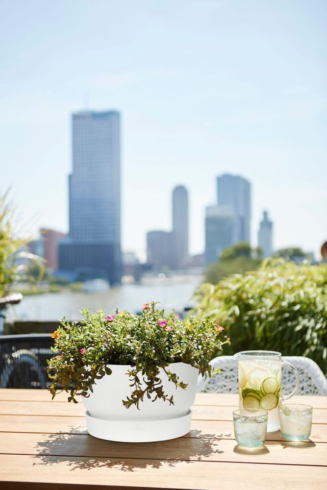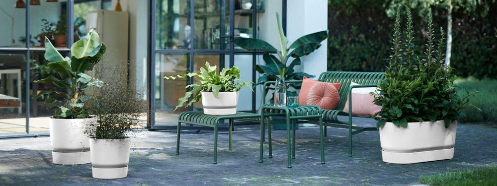 This beautiful designer pot made from recycled plastic is frostproof and therefore suitable for all seasons in the garden or on the terrace. The pot has an integrated water reservoir so your plants will always have enough water. These flower pots are made from high-quality plastic, are easy to clean, and are sturdy. The greenville family combines a modern, sophisticated design trend with a clever, practical water solution for everyday plantcare. The seamless, sleak design pot in natural tones contains an integrated water reservoir. elho not only gives room to nature, but makes nature happy, by introducing this range, made with 100% recycled materials.