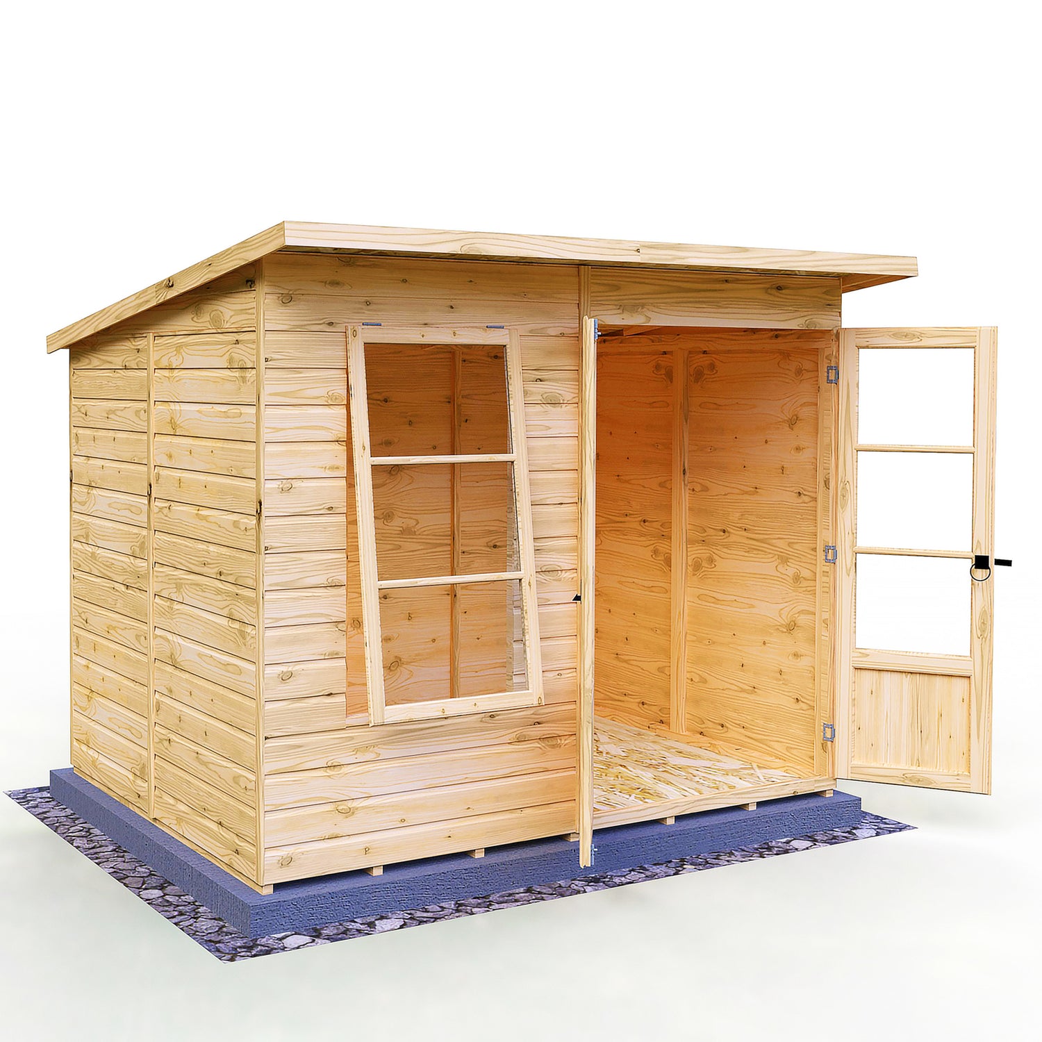 The Dahlia Summerhouse is complete with acrylic safety glazing with a window bar feature. Double doors to the front provide excellent access for furniture. This lovely pent roof garden room is constructed from high grade overlap cladding to the walls over 34mm strong framing with OSB floor and roof. Dipped base coat preservative ready for you to top coat.