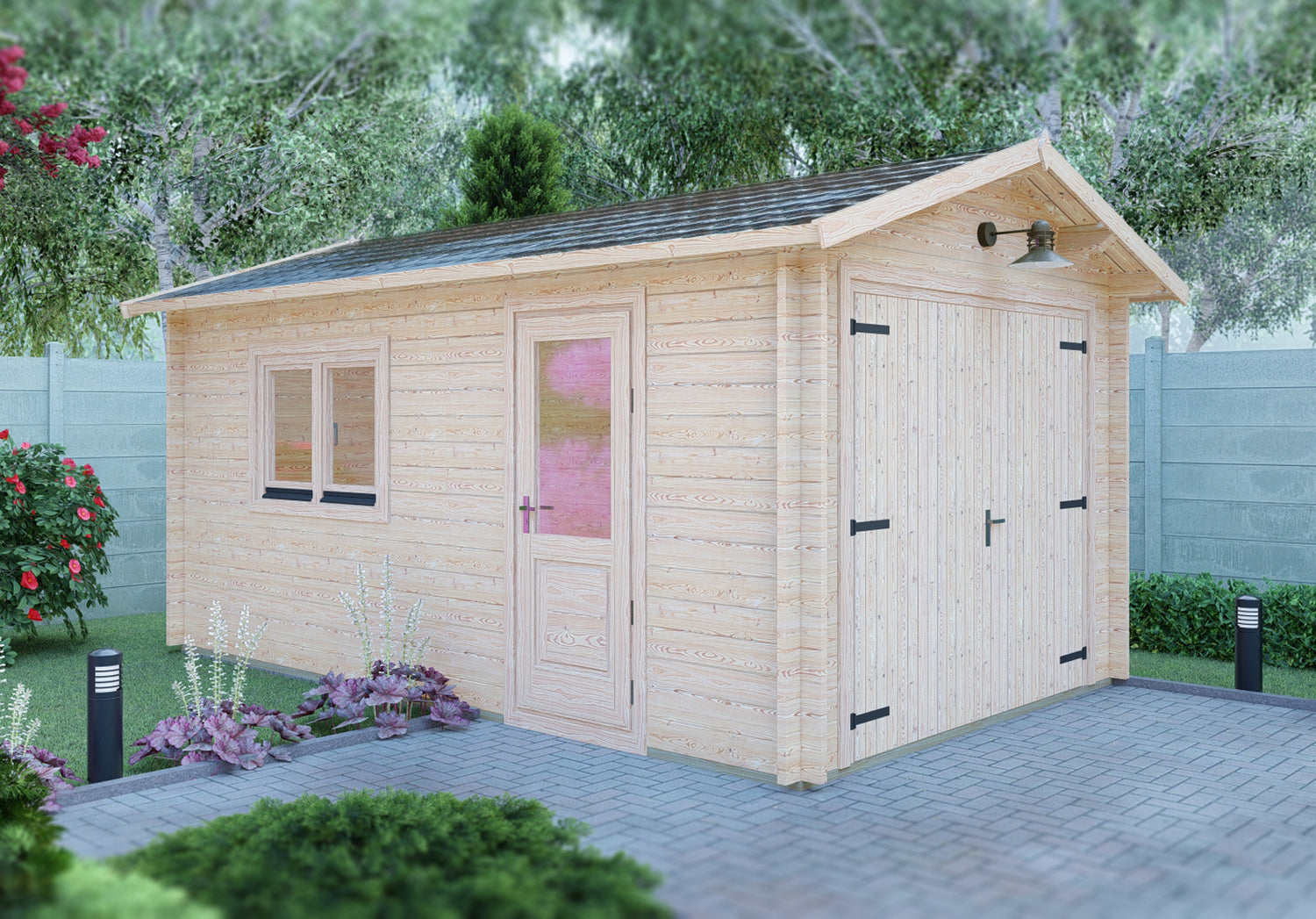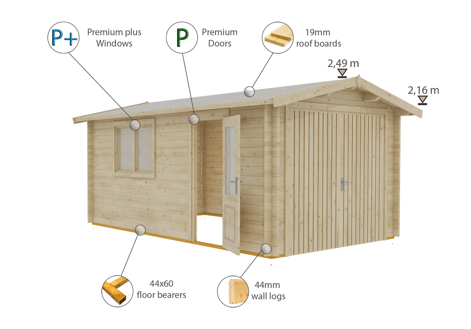 Shire's Log Cabin Garage features walls constructed from interlocking timbers that are an impressive 44 mm thick. There is a part glazed side door and one large, opening window to allow natural light. All glazing is toughened, double glazed glass units. The double door and side door are both fitted with a high quality silver door handle and mortice lock. The apex roof is 19 mm timber boards T&G completed externally with roof felt. There is no floor supplied and the walls sit on a 44 x 60 mm base rail. Where dimensions are critical please check internal (floor) sizes as building dimensions are to the external edge of the individual boards that make up the cabin and will include the crossover of the logs. Please note that log cabins are supplied untreated as individual log boards that are assembled length by length, building up from the floor; not pre-made panels.