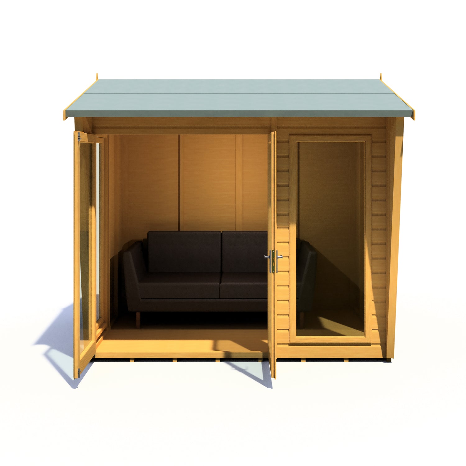 Proudly handmade in the UK, the contemporary Burghclere Summerhouse is a stunning design updating the traditional summerhouse into a modern garden room. The high quality double doors open out to the front with a small canopy over and there are large fixed side windows. The windows and doors are fitted with acrylic safety glazing and are traditional joinery made in a storm resistant design. The doors are also fitted with a mortice lock. The building is constructed on strong 34 mm square framing and clad with planed shiplap tongue and groove boards made only from the highest grade, slow grown, FSC approved pine. The floor and roof are 12mm T&G with mineral roof felt supplied to complete the roof exterior. The summerhouse is supplied with a dip treated base coat preservative ready for you to top coat to your choice immediately on installation; this could be a paint or a stain.