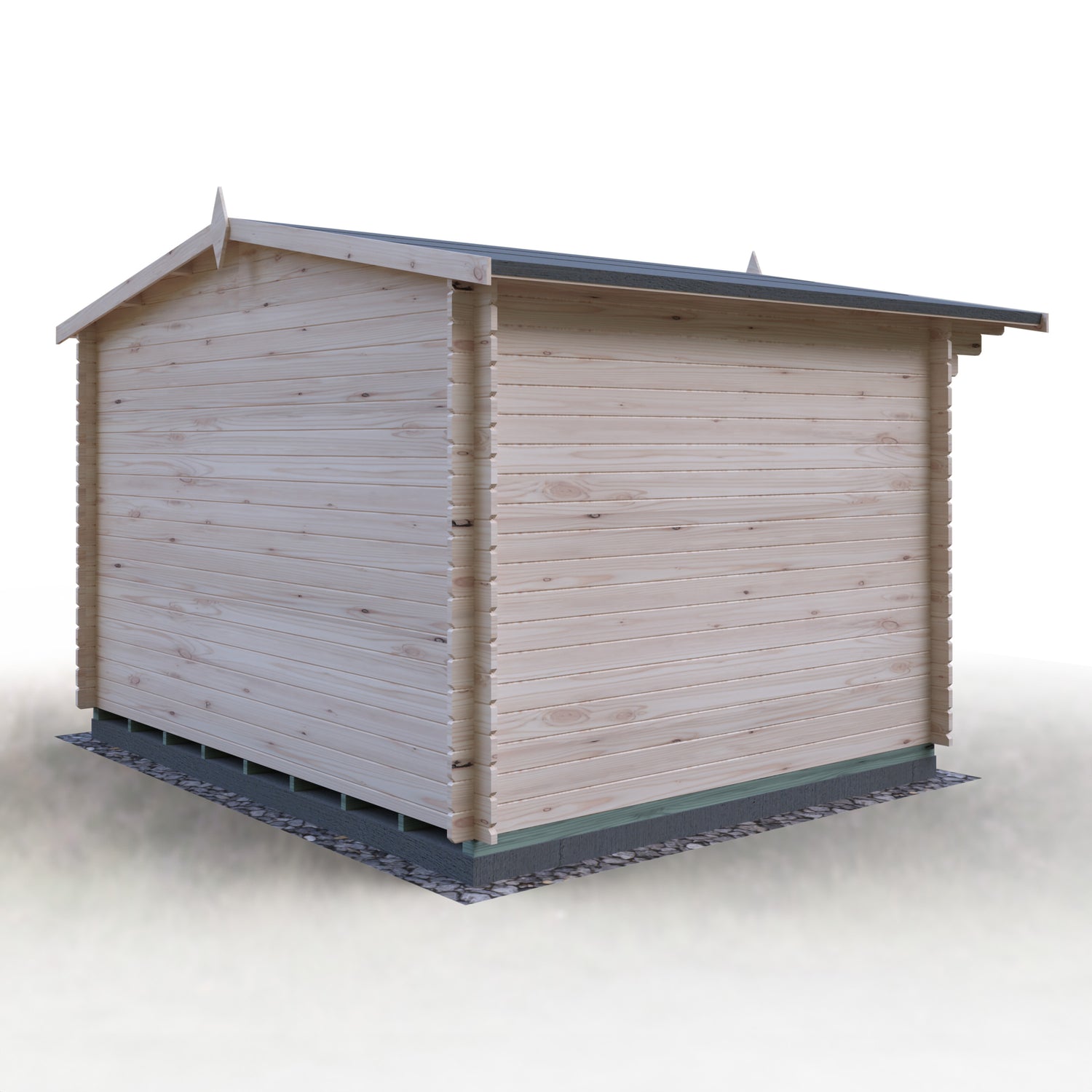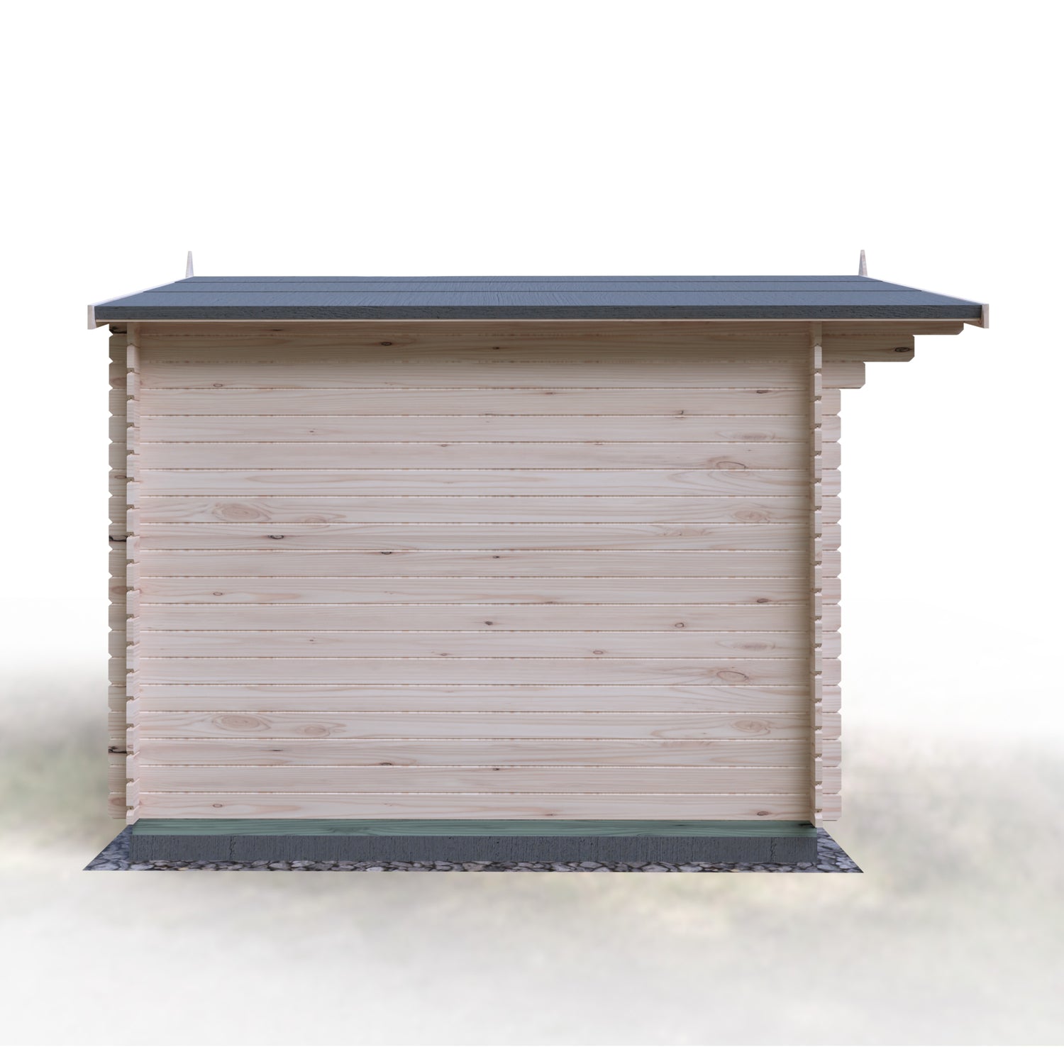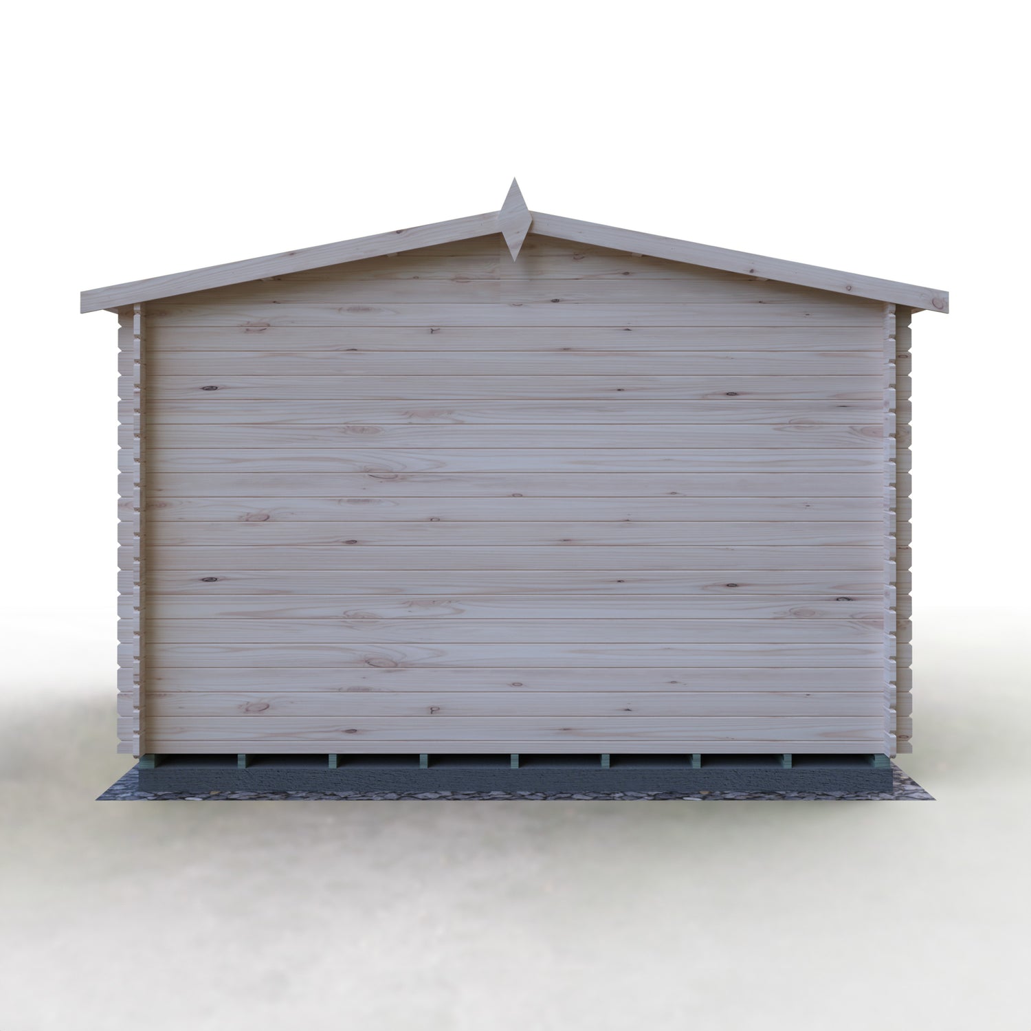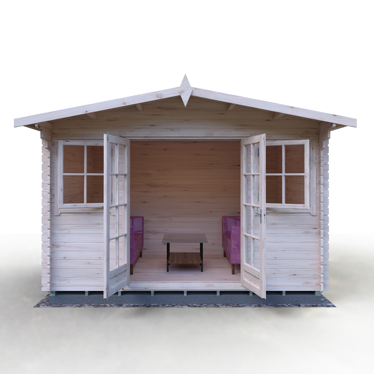 A stunning and practical log cabin that provides a wonderful outdoor room, perfect for relaxing or working. The frameless interior of a log cabin construction gives you a unique appearance. The double doors and opening front windows allow lots of natural light and are supplied with toughened glass for safety. The doors are also fitted with a mortice lock. All doors and windows are completed with a draught excluder to maintain a cosy interior. The roof and floor are 15 mm T&G with the floor also including pressure treated bearers. The interlocking timbers that make up the walls of the building are an impressive 28 mm thick. Internal eaves height is 6'10 / 2.086 m for a really spacious interior. The building is supplied untreated ready for you to paint or stain immediately after assembly with a good quality wood paint or stain. Where dimensions are critical please check internal (floor) sizes as building dimensions are to the external edge of the individual boards that make up the cabin and will include the crossover of the logs. Please note that log cabins are supplied as individual log boards that are assembled length by length, building up from the floor; not pre-made panels.