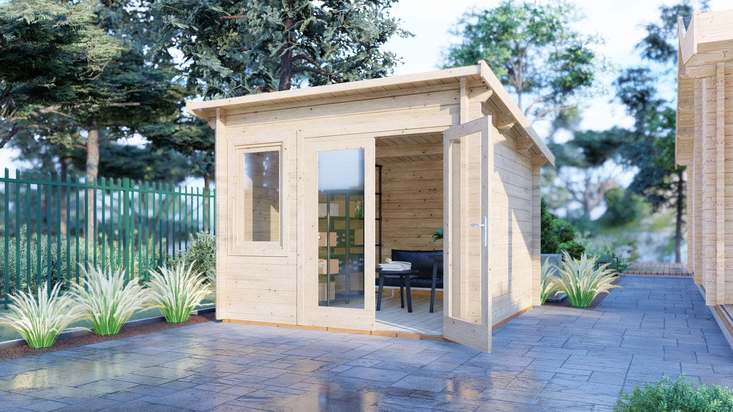 The Elm Log Cabin is a very popular building combining many of the attributes of a traditional summerhouse with the structure and performance of a log cabin. The frameless interior provides an authentic log cabin experience and with an internal height over 7 ft it is a comfortable space for all. The interlocking timbers that make up the walls of the building are an impressive 44 mm thick. The glazed front provides plenty of natural light and all glazing is toughened glass. Both window and doors have high quality mortise and tenon joinery and are fitted with draft excluders to compliment the storm resistant design. The lockable double door and opening window position to the front are interchangeable. The roof and floor are 19 mm tongued and grooved timber and the floor bearers are pressure treated for long life. It is manufactured from high grade, slow grown, FSC approved, northern European pine. Please note that log cabins are supplied untreated as individual log boards that are assembled length by length, building up from the floor; not pre-made panels.