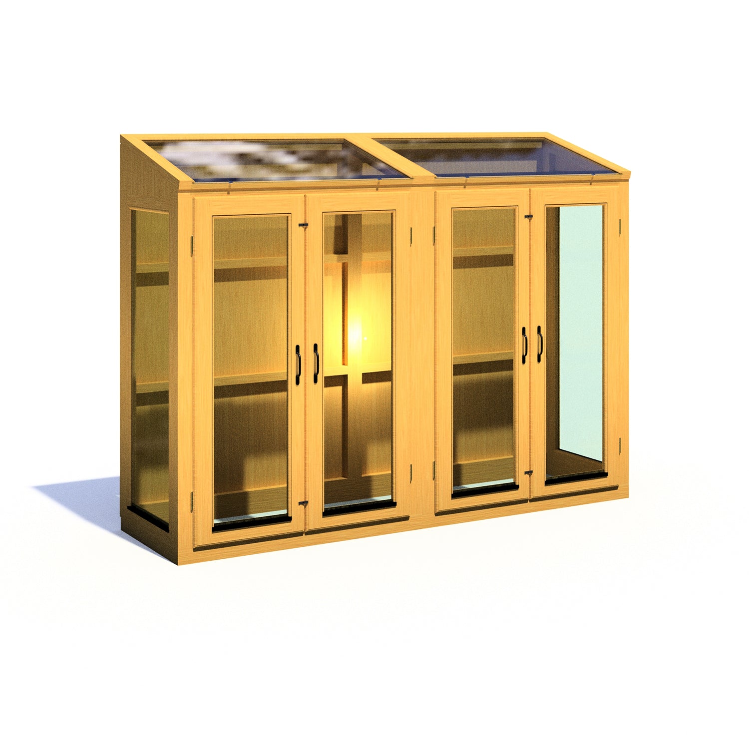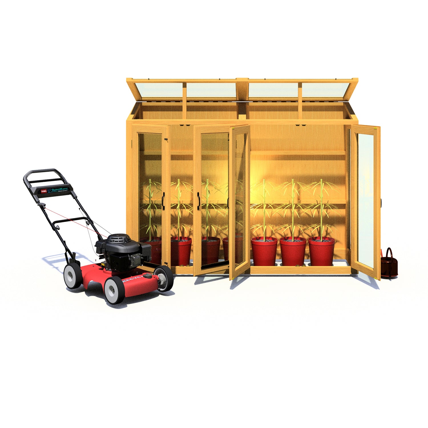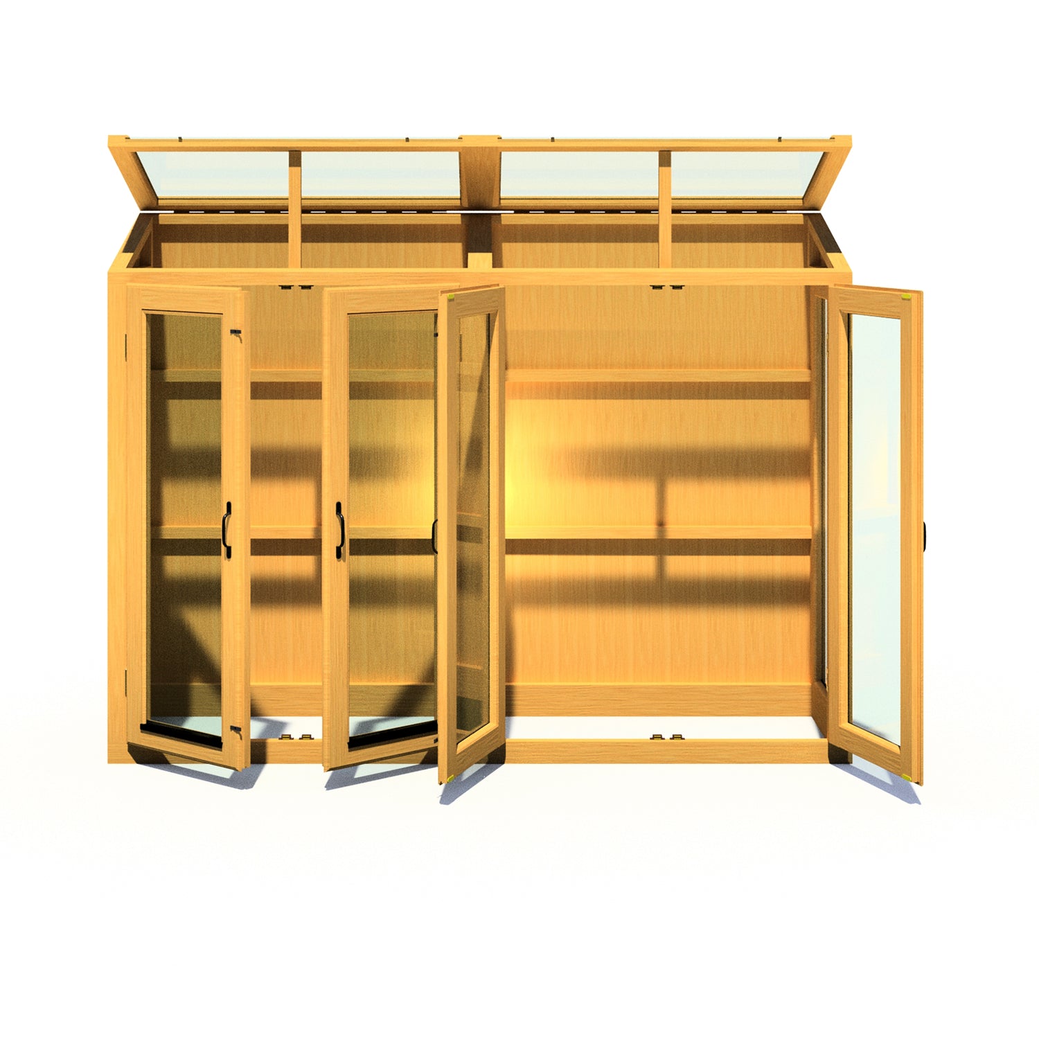 The Heydon is a very practical lean to greenhouse which will provide all the advantages of a timber greenhouse in a compact design. The Heydon will make a feature of a plain wall as well as being a great asset if you "Grow Your Own". It is manufactured with high grade pine, 34 x 58 mm framing. The greenhouse is glazed with toughened glass and has two sets of double doors for very convenient access. The roof can be opened on a hot day to provide excellent ventilation. As usual with a greenhouse, no floor is supplied and the greenhouse sits on a pressure treated base rail. The wooden components have been dipped with a base coat preservative ready for you to top coat to your own preference. Assembly instructions included.