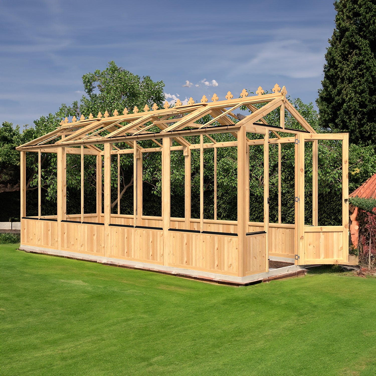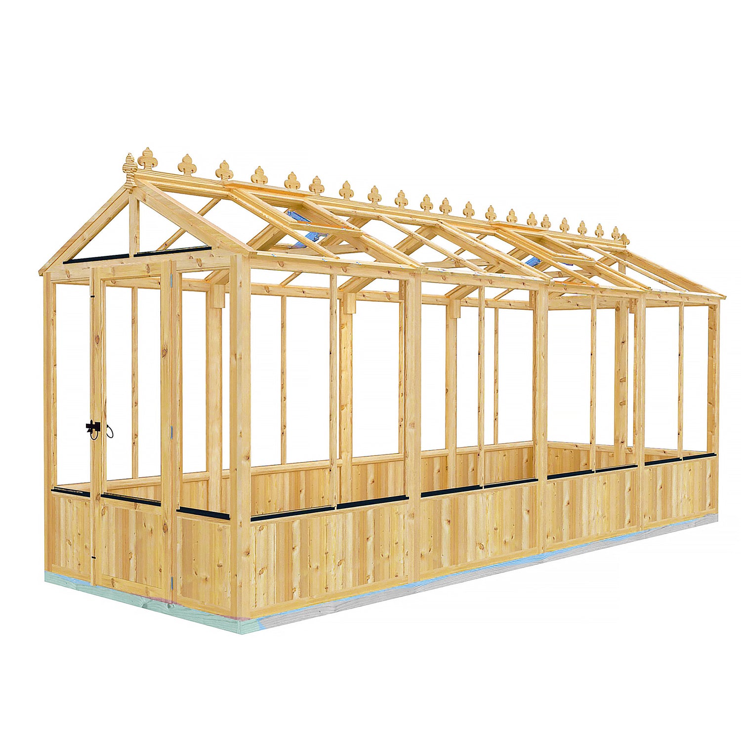 The Holkham is a stunning greenhouse available in a range of sizes to suit everyone. A wooden greenhouse has many advantages for gardeners and will also provide you with a relaxing environment to potter in. Featuring Shire's quality joinery, 34 x 58 mm framing and completed with an attractive finial and cresting to the roof, the Holkham is both practical as well as charming. The low wooden panels also add a very traditional detail to this lovely building. The greenhouse is glazed with toughened glass and has a single door with traditional gate latch handle. Roof windows have an automatic Bayliss opener supplied. The number of opening roof windows per model is, one in the 4 x 6, two in a 6 x 8, three in a 6 x 12 and four in a 6 x 16. As usual with a greenhouse, no floor is supplied and the greenhouse sits on a pressure treated base rail. No shelving or benching included. The wooden components have been dipped with a base coat preservative ready for you to top coat to your own preference. Assembly instructions included.