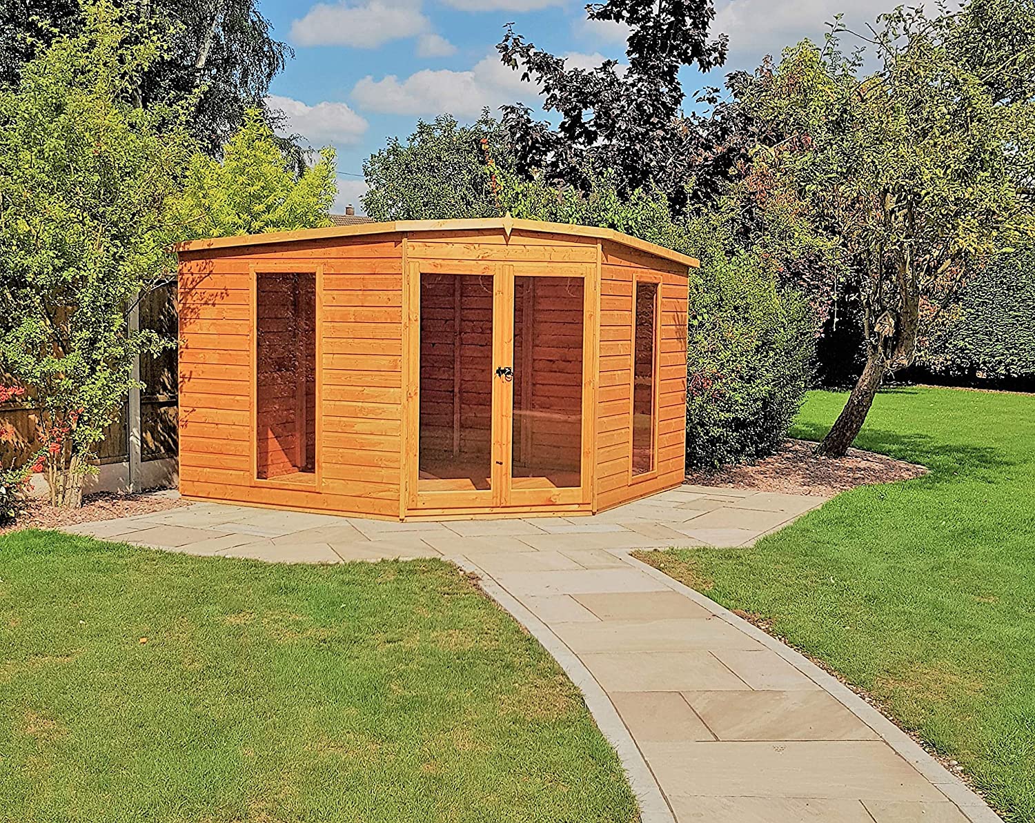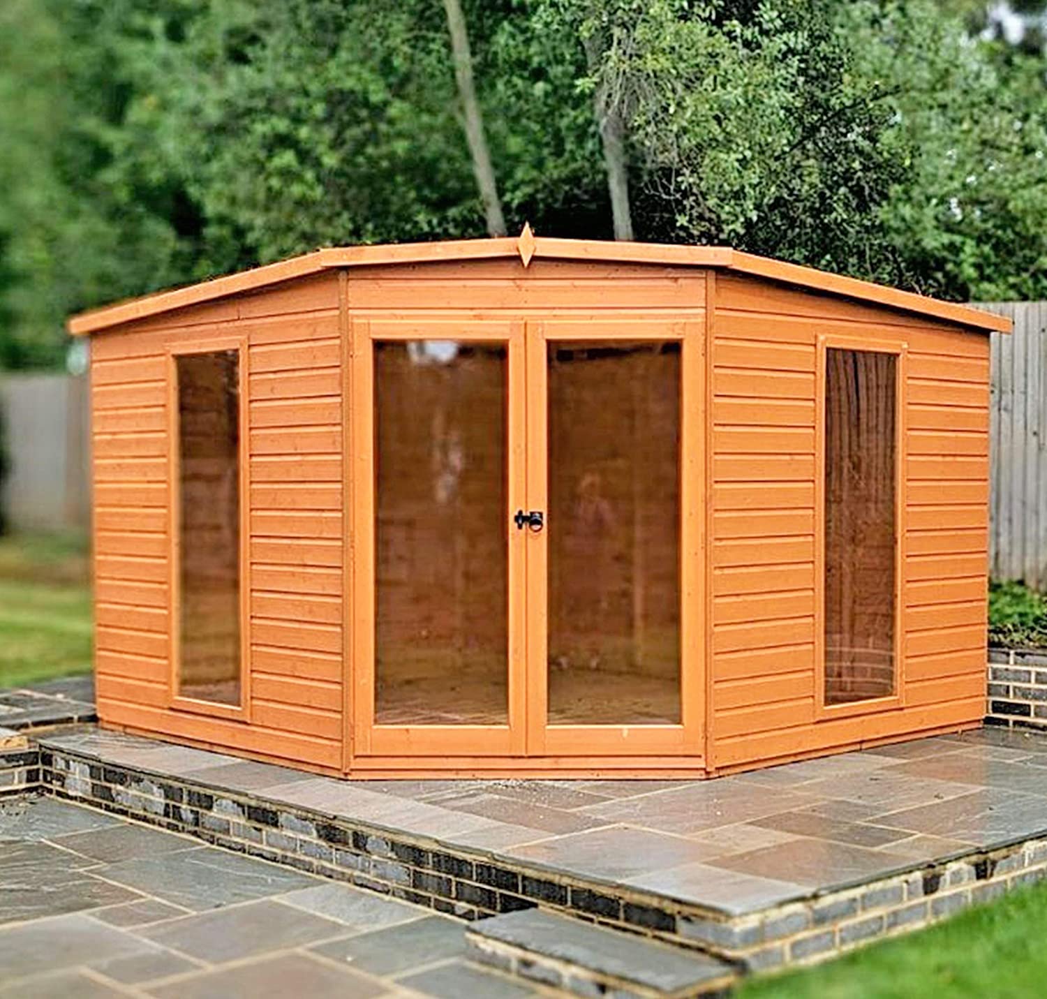 The Barclay is a magnificent, handmade summer house designed to complete a corner of your garden. With its full height, acrylic safety glazed windows and lockable double doors, this summerhouse is full of light and is a delight to spend your time in. Wall panels are made from 12mm shiplap boards and all framing is sturdy 44mm square. This lovely corner house is manufactured from high grade FSC certified northern European pine. The roof and floor are tongued and grooved timber. Dipped base coat preservative ready for you to top coat.