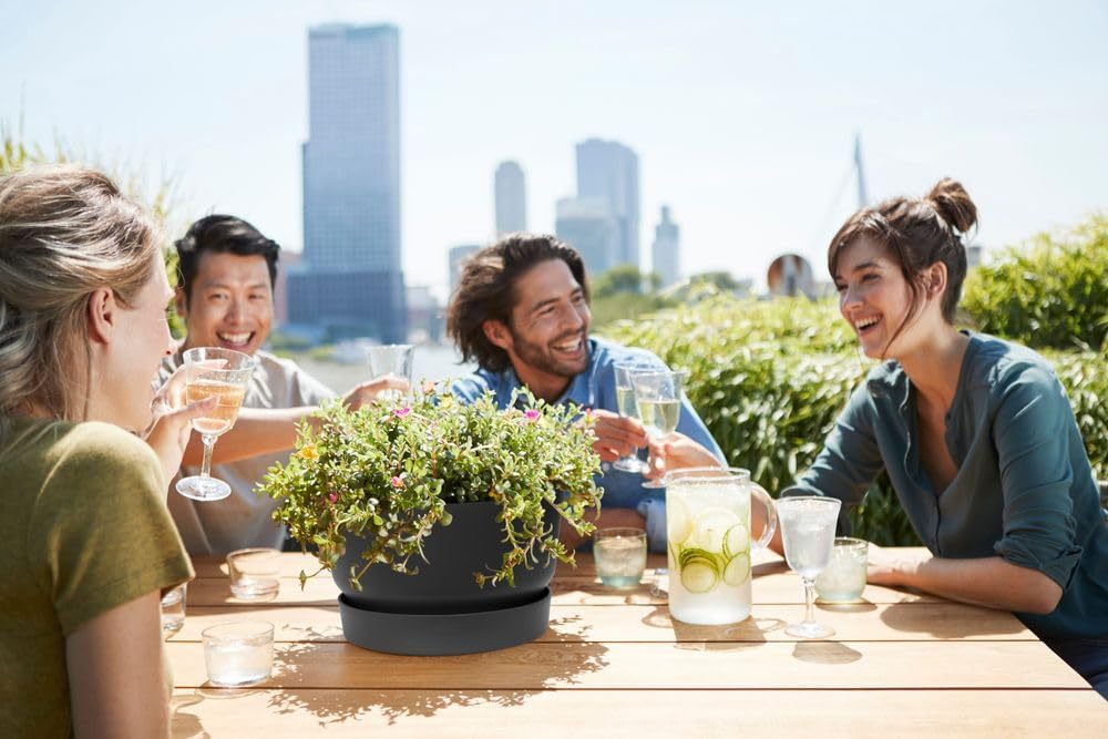 This beautiful designer pot made from recycled plastic is frostproof and therefore suitable for all seasons in the garden or on the terrace. The pot has an integrated water reservoir so your plants will always have enough water. These flower pots are made from high-quality plastic, are easy to clean, and are sturdy. The greenville family combines a modern, sophisticated design trend with a clever, practical water solution for everyday plantcare. The seamless, sleak design pot in natural tones contains an integrated water reservoir. elho not only gives room to nature, but makes nature happy, by introducing this range, made with 100% recycled materials.