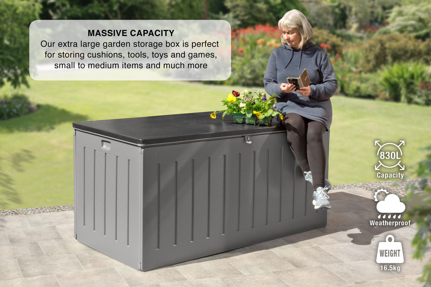 Huge Grey 830L Outdoor Storage Box is backordered and will ship as soon as it is back in stock.