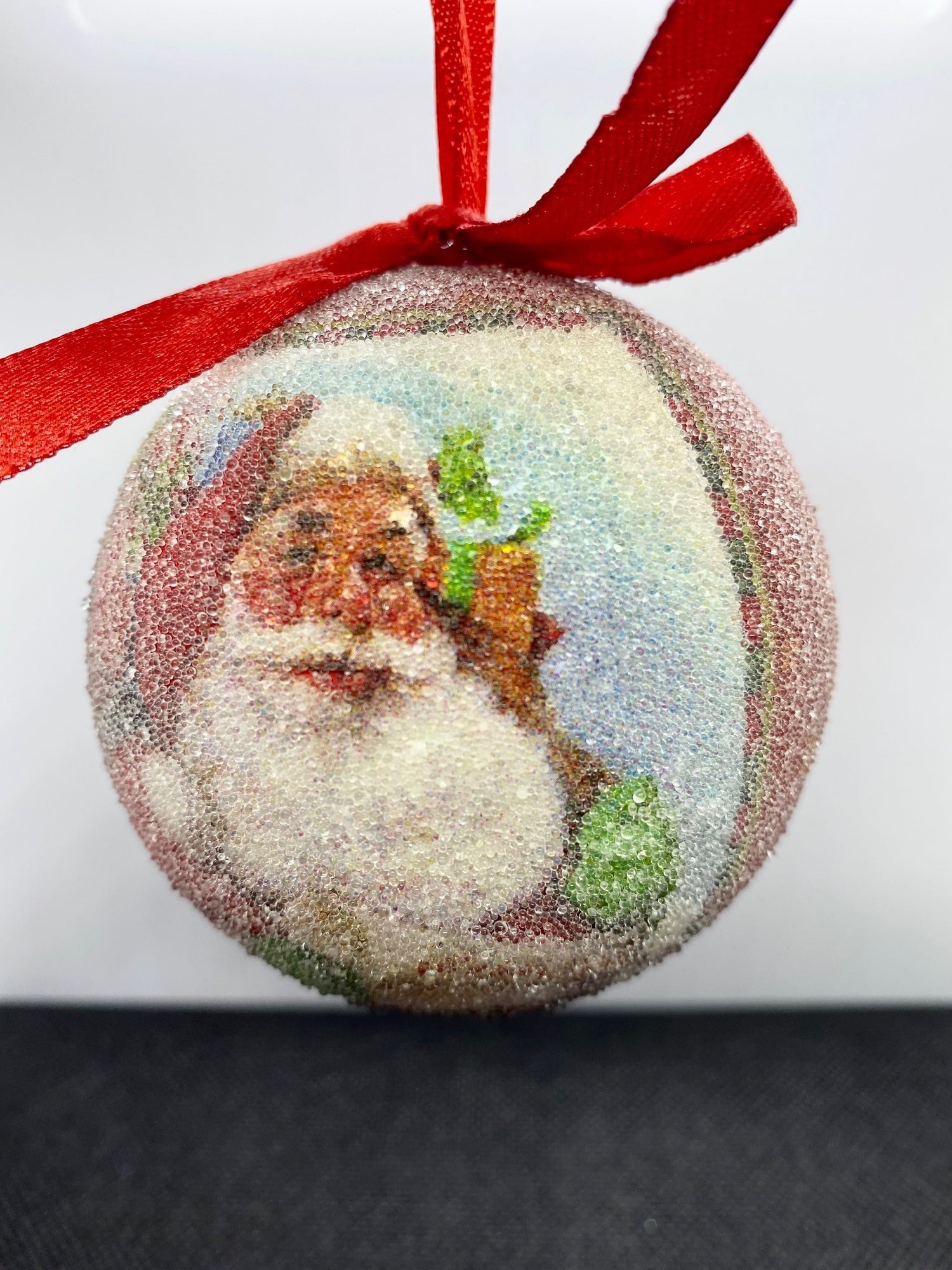 Red ribbon detail and red ribbon loop to hang it on your tree.